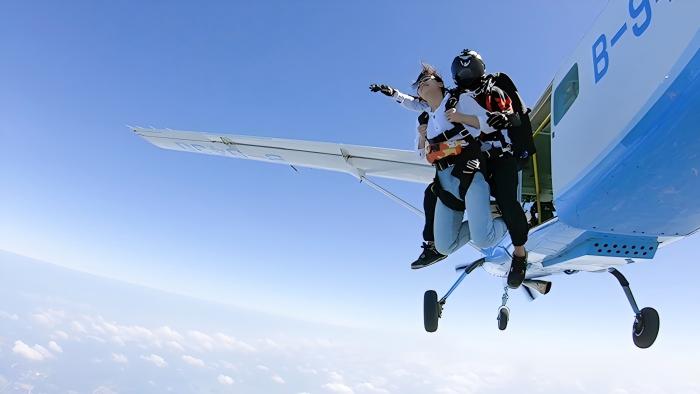 专业教练开展 30 分钟地面培训,讲解出舱姿势、自由落体呼吸技巧和着陆缓冲动作。随后穿戴全套装备:防风跳伞服、安全背带、头盔和护目镜,戴眼镜者可领取适配镜套,确保高空视野清晰。