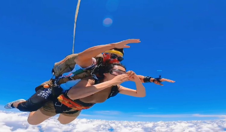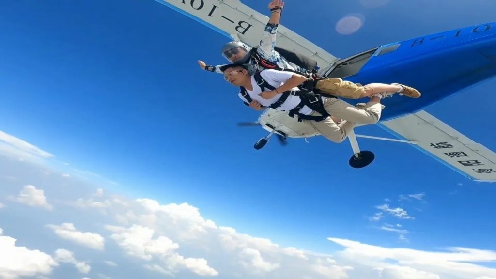 与教练一同登机后,12 分钟的攀升过程中,南岳衡山的飞檐古刹、湘江的粼粼波光与田野城镇的交错风貌逐渐铺展。抵达 3000 米高空,舱门打开时带着山林清香的气流扑面而来,跟着教练倒数跃出机舱,30 秒内以 200 公里时速自由落体,风声呼啸中感受心跳飙升的极致刺激。